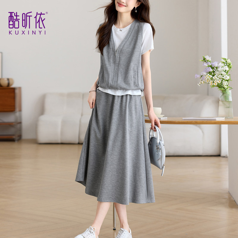 佳人苑套装女2026年春季新款圆领针织内搭宽松马甲连衣裙两件套