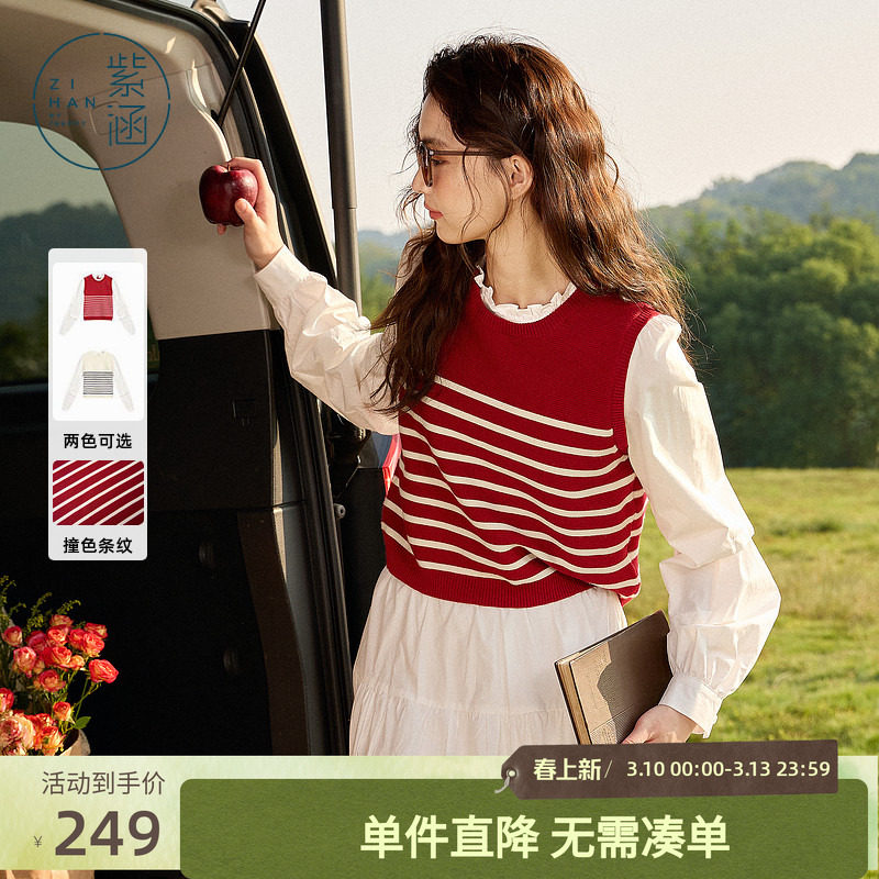 紫涵假两件撞色条纹针织马甲女春秋季新款甜美木耳领套头针织衫潮