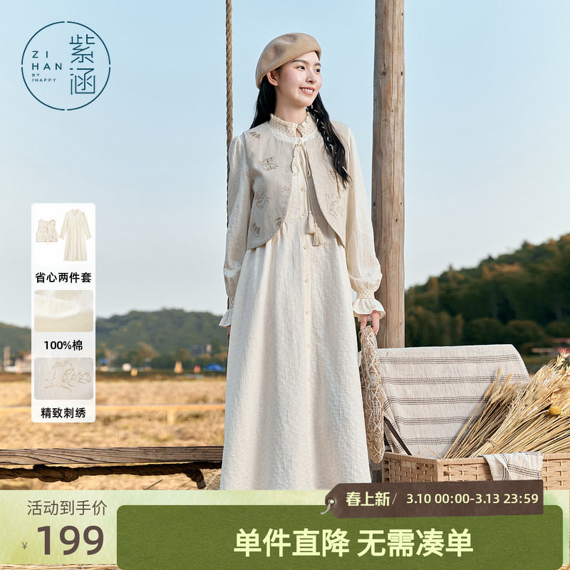 紫涵日系刺绣马甲背心立领宽松衬衫连衣裙两件休闲套装女秋季新款