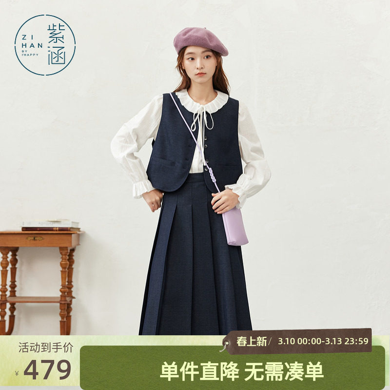 紫涵蓝色圆领马甲背心高腰a字百褶半身裙上下两件套装女秋季新款