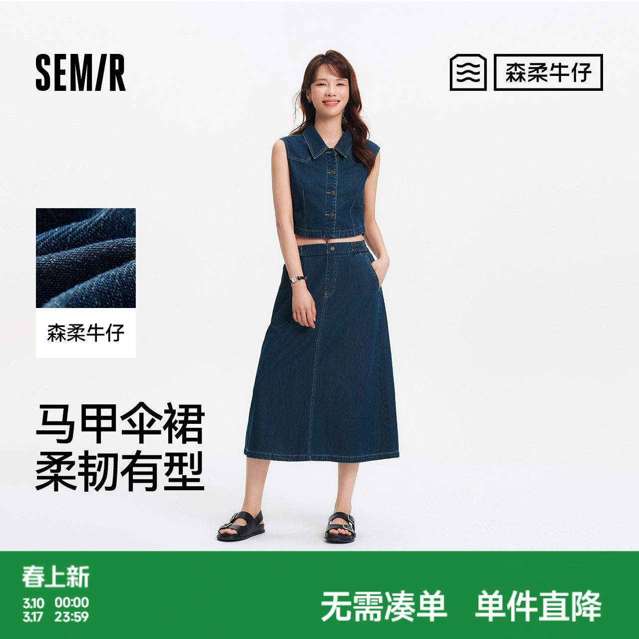 森柔|森马牛仔套装女夏松紧腰伞裙翻领短马甲潮流港风街头两件套