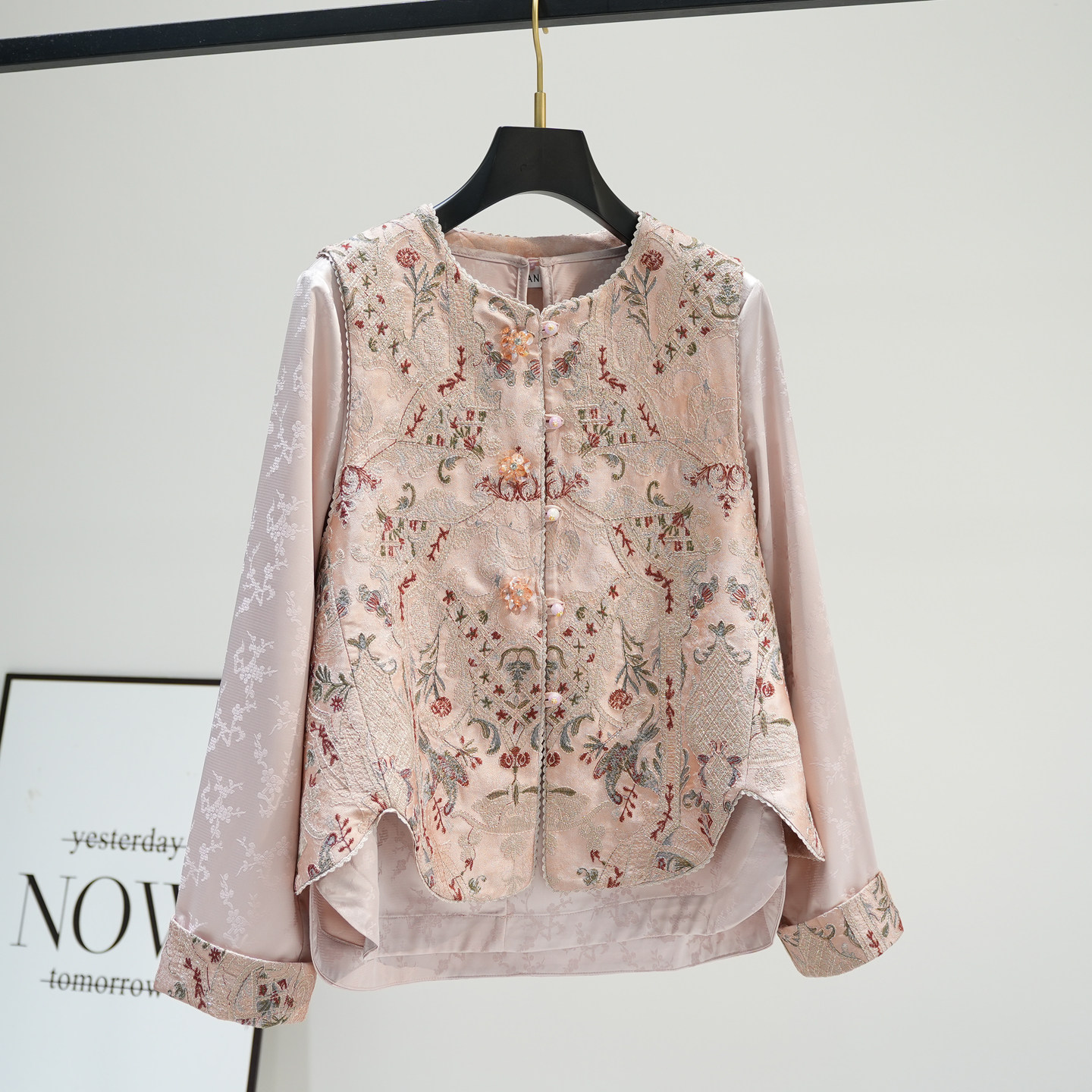 新中式刺绣两件套女2026春季新品国风马甲提花暗纹卷边袖上衣套装