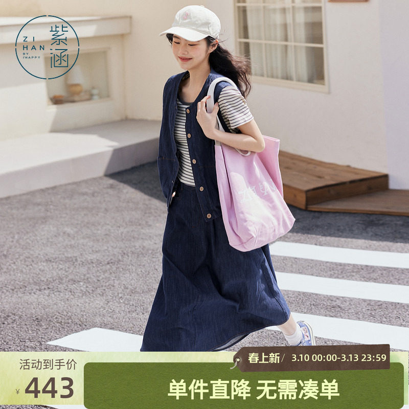 紫涵藏青马甲半身裙休闲套装女秋季新款韩系高级感宽松叠穿两件套