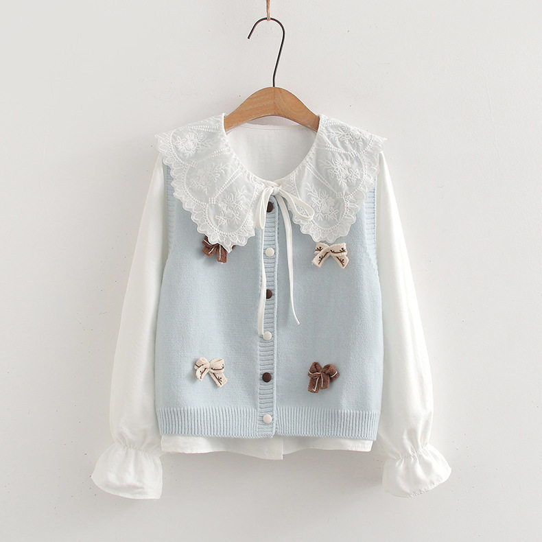 2026春季套装女学院风甜美蝴蝶结针织衫马甲+娃娃领衬衫两件套装