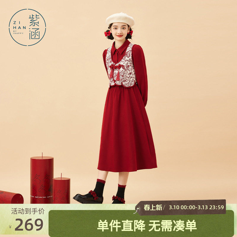 紫涵新中式盘扣马甲背心收腰衬衫连衣裙两件套装女秋季新款a字裙