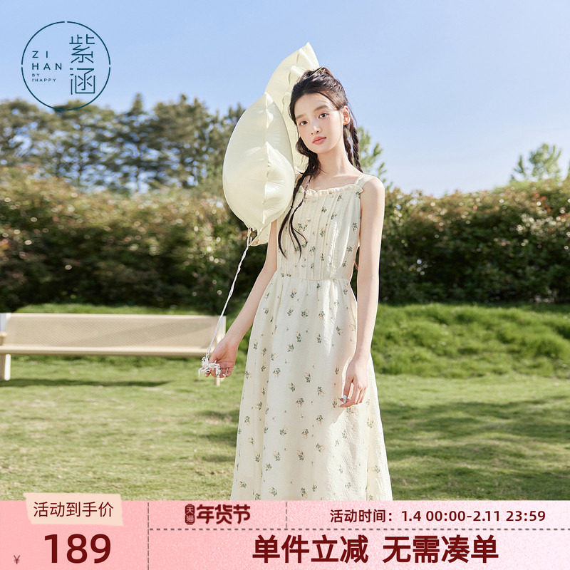 小清新碎花茶歇吊带连衣裙2025夏韩版中长款裙子142LH263强明女装
