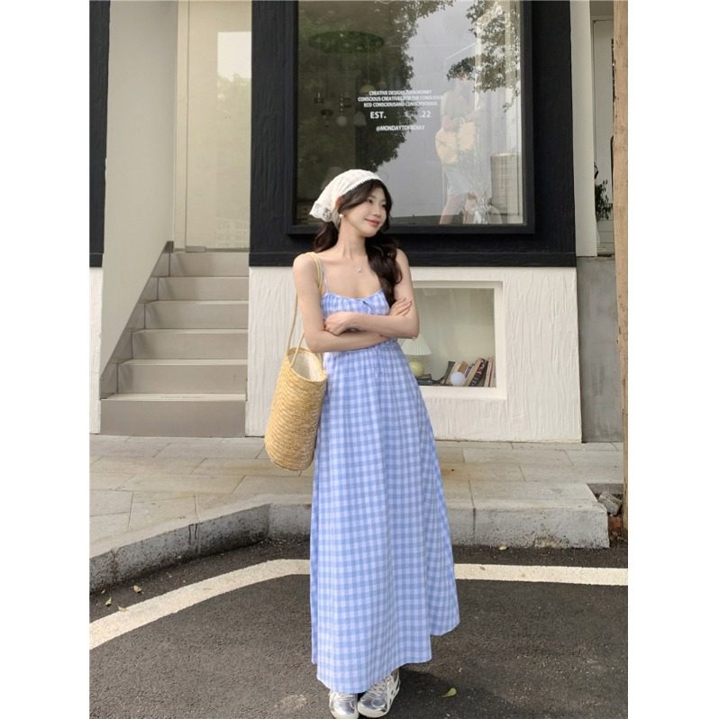 夏季法式新款度假风格子吊带连衣裙2025小清新蓝收腰长裙显瘦度假