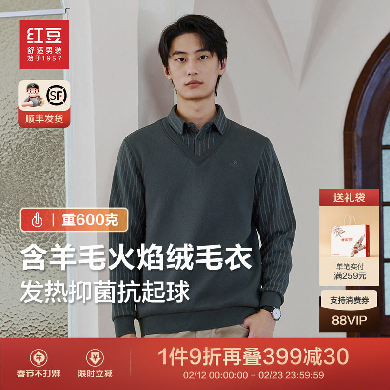 红豆加绒假两件毛衫中老年爸爸保暖打底衫内搭衬衫领针织衫毛衣男