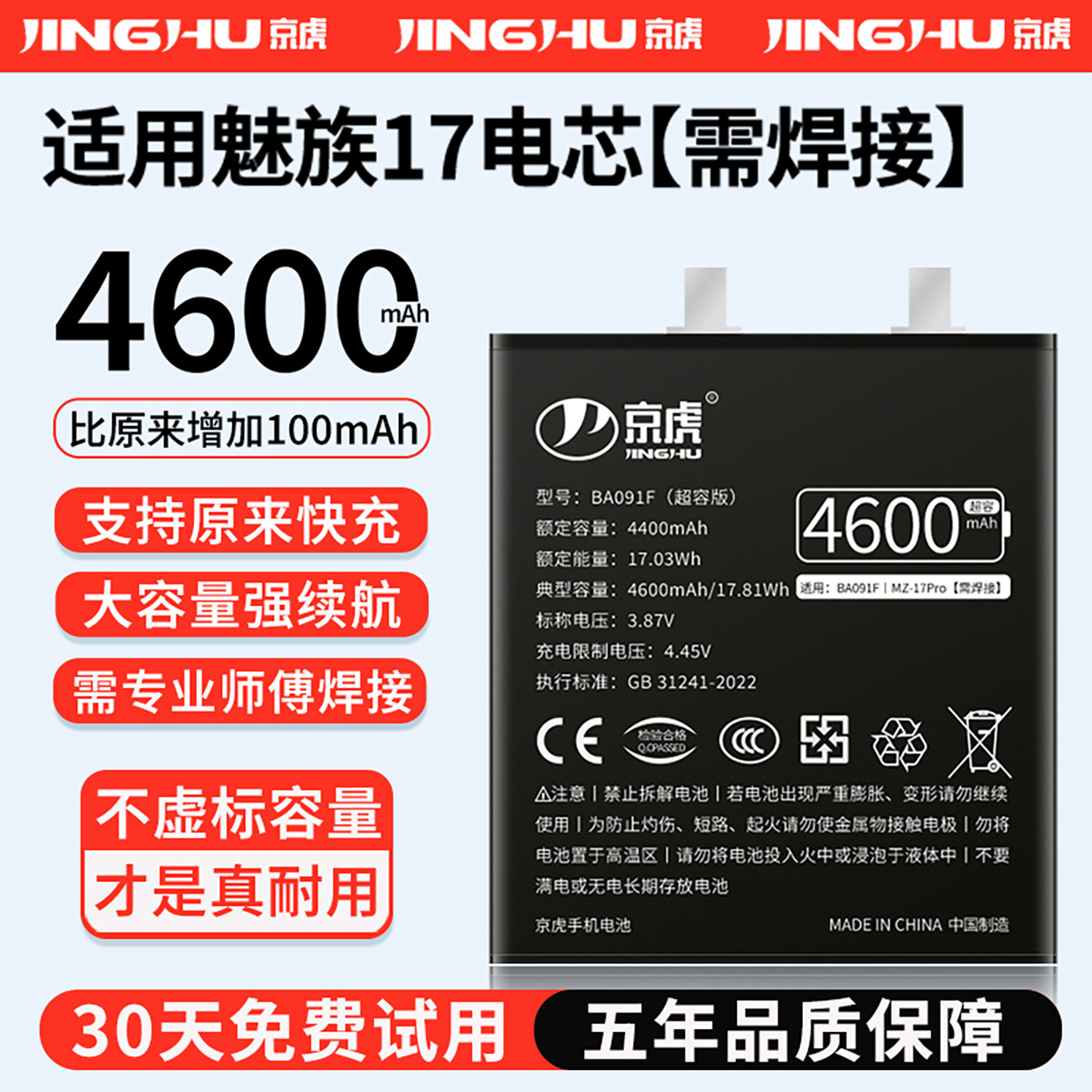 (增加续航)品质京虎适用于魅族17电池扩容大容量可拆卸内置手机电池高容增强版电板更换旗舰版BA091F非原装