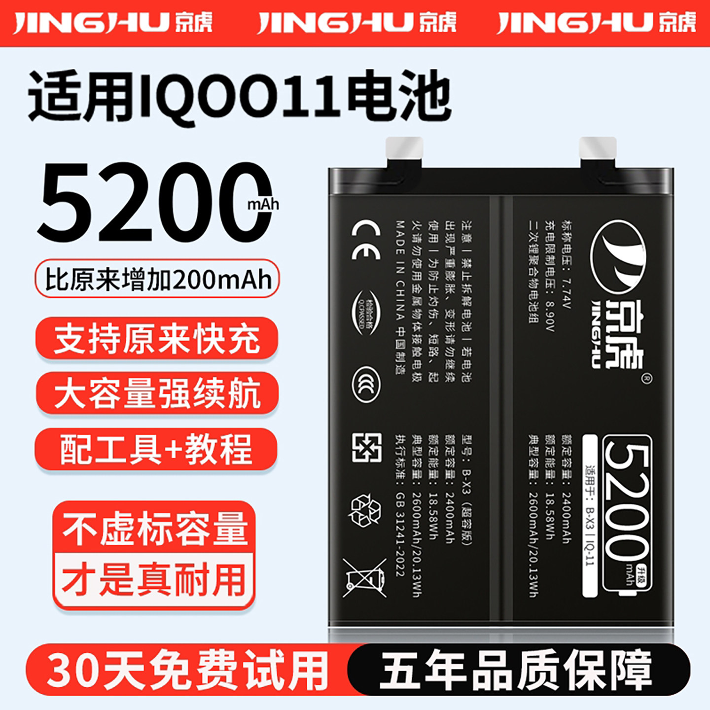 (增加续航)品质京虎适用于IQOO11电池扩容大容量可拆卸内置手机电池高容增强版电板魔改更换旗舰版B-X3非原装