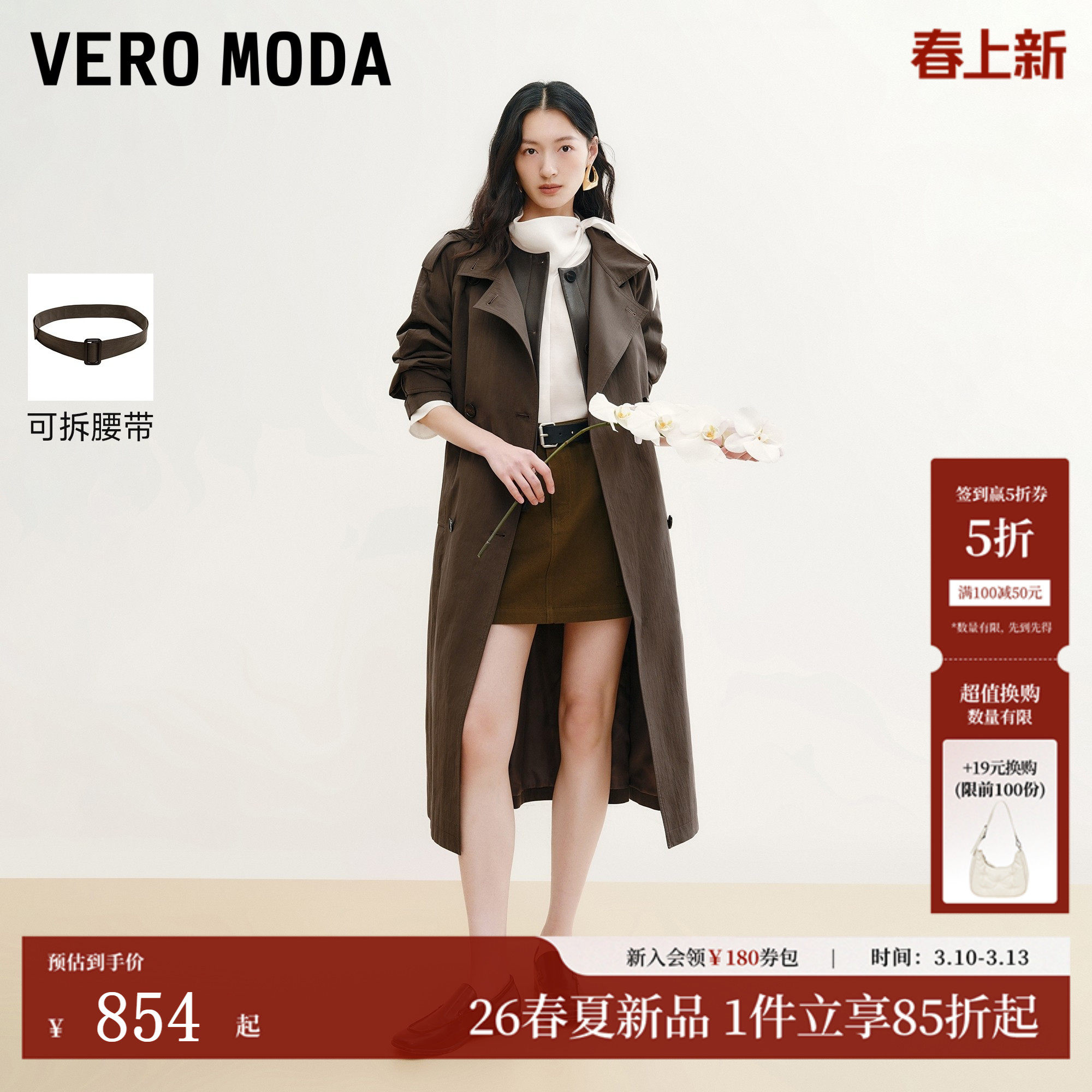 Vero Moda夹克女2026春季新款纯棉双排扣风衣式可拆领袢326117013