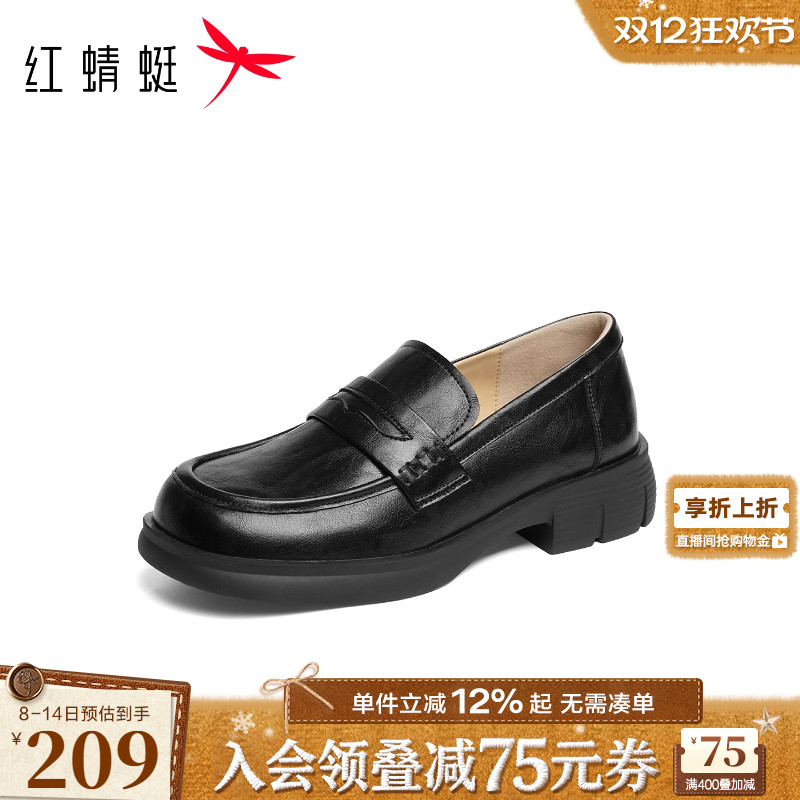 红蜻蜓乐福鞋女2025秋冬新款女鞋一脚蹬黑色皮鞋真皮厚底妈妈单鞋