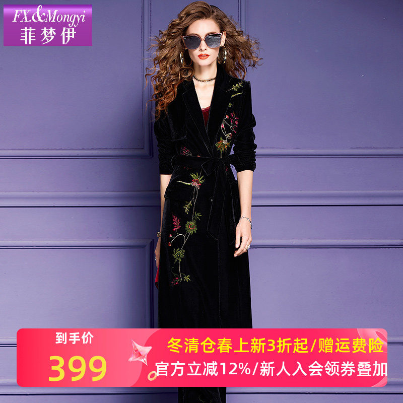 菲梦伊金丝绒绣花黑色套装女春季复古中长款西装外套大衣阔腿裤子