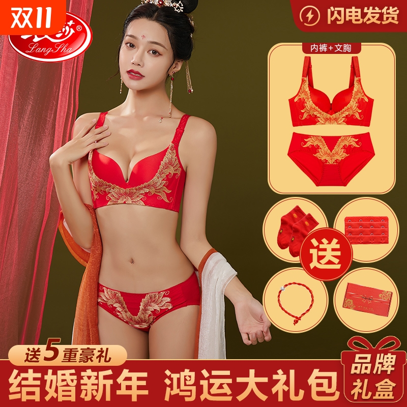浪莎本命年大红色文胸套装内衣女蛇年结婚新娘美背聚拢胸罩无钢圈