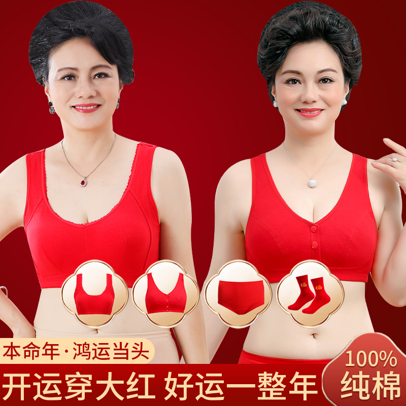 妈妈本命年内衣套装女士大红色前扣文胸无钢圈中老年人背心式胸罩