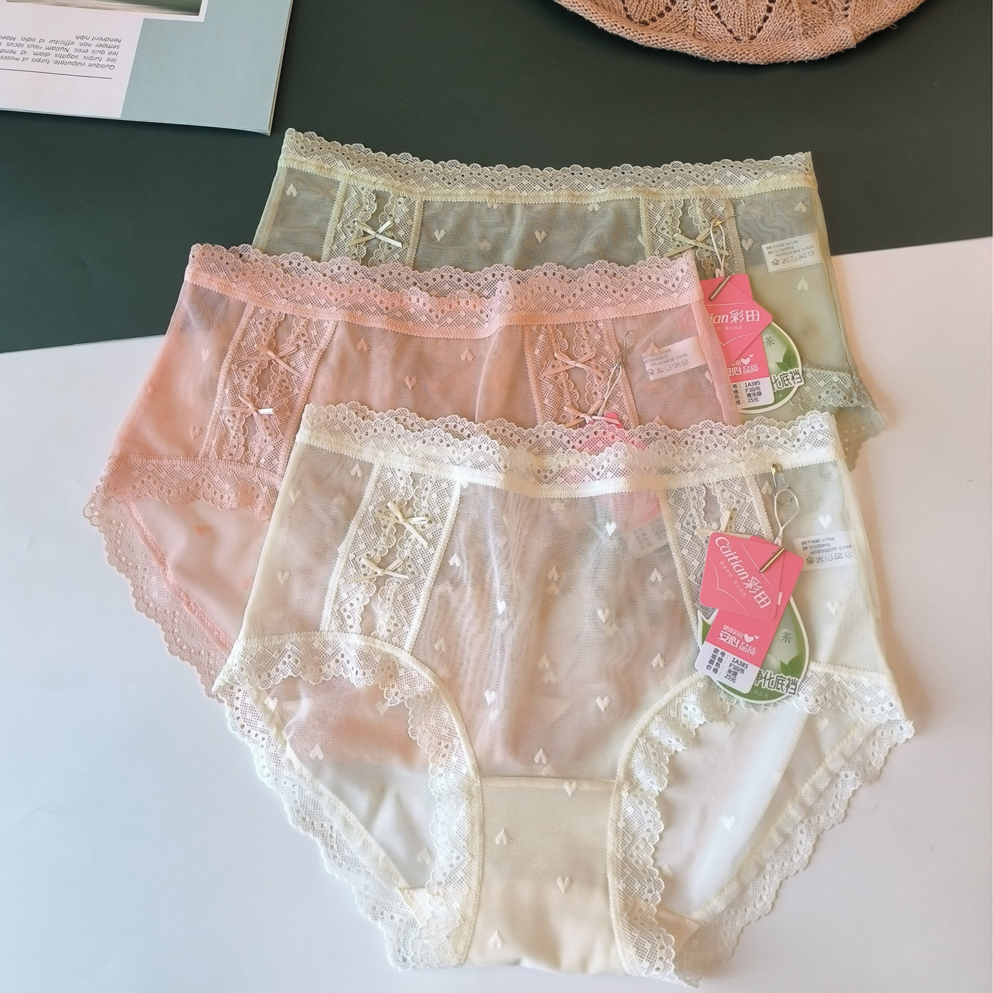 彩田新款蕾丝女内裤中腰超薄镂空性感提花网纱7A抗菌裆女士三角裤