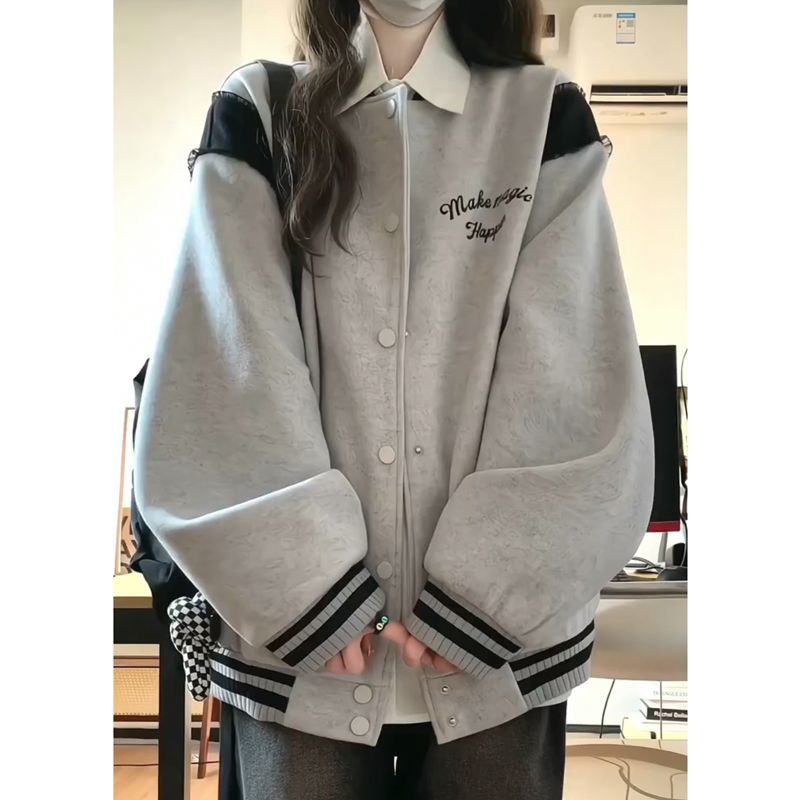 饭饭又饿了美式棒球服外套女秋冬设计感纯棉休闲运动宽松显瘦上衣