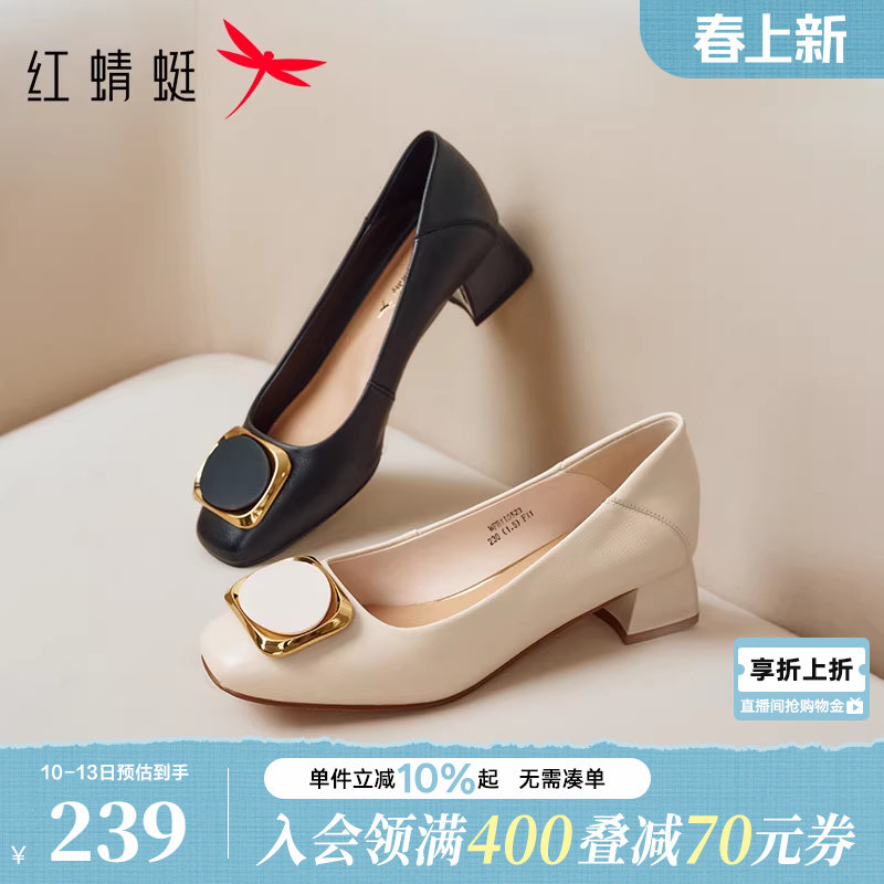 红蜻蜓面试高跟鞋女粗跟女鞋白色工作单鞋职业鞋子黑色公务员皮鞋