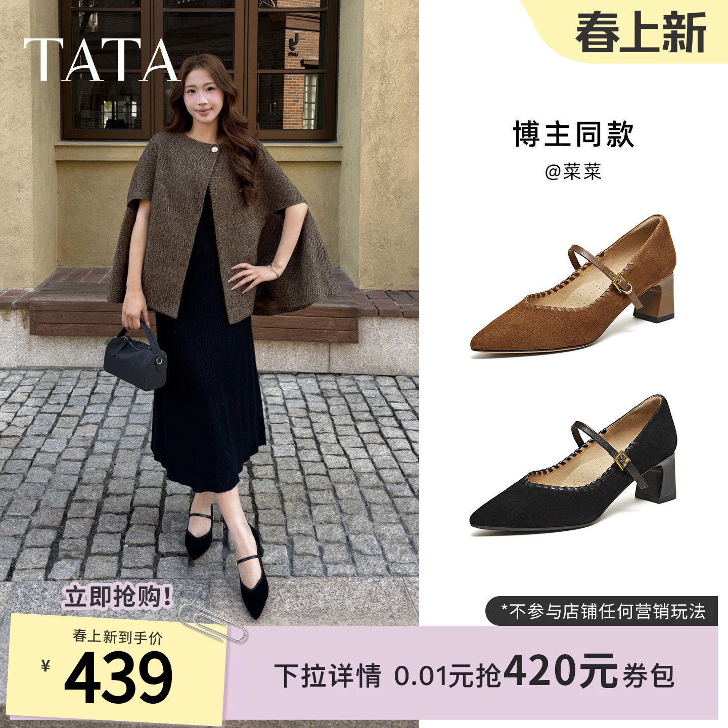 TATA他她粗跟玛丽珍鞋女黑色高跟鞋尖头单鞋女鞋2026新款XGM06AQ6