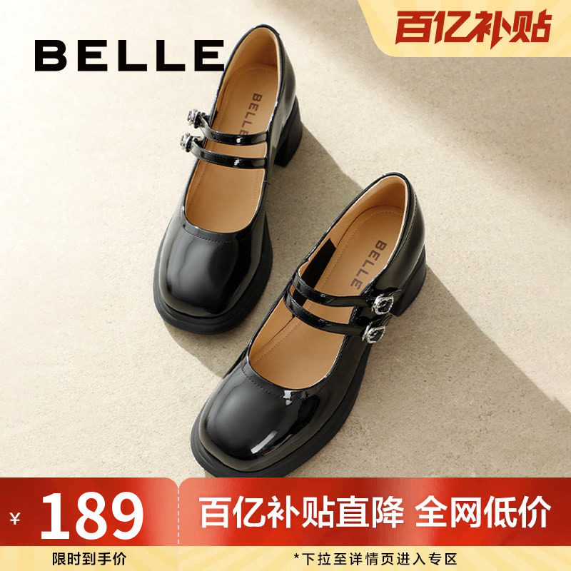 百丽女鞋粗高跟玛丽珍鞋女新款通勤漆皮小皮鞋浅口单鞋子3A601AQ4