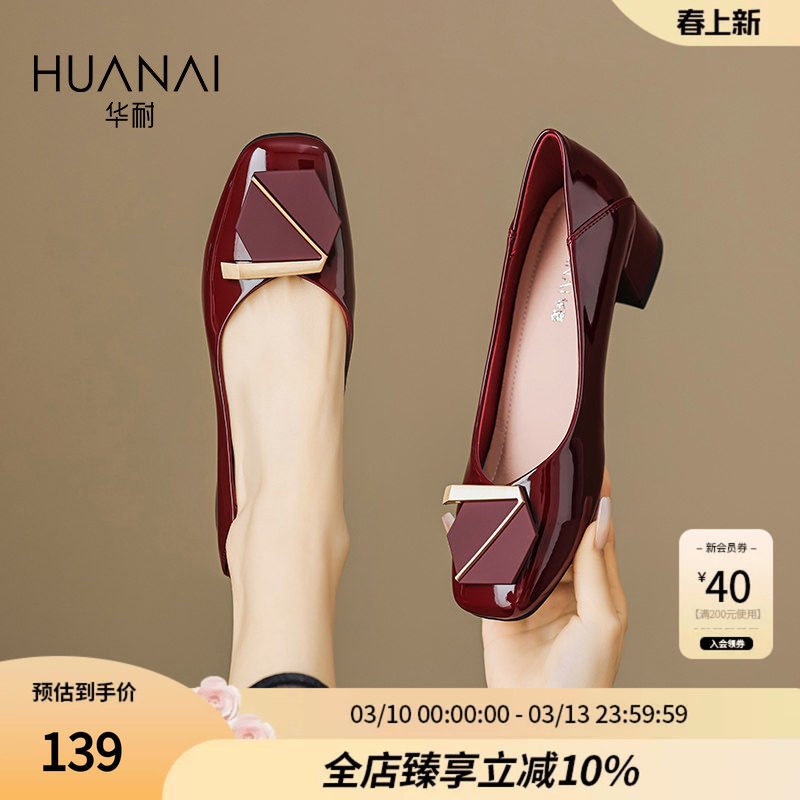 华耐粗跟单鞋女2026新款浅口高跟鞋女鞋酒红色妈妈鞋喜婆婆婚宴鞋