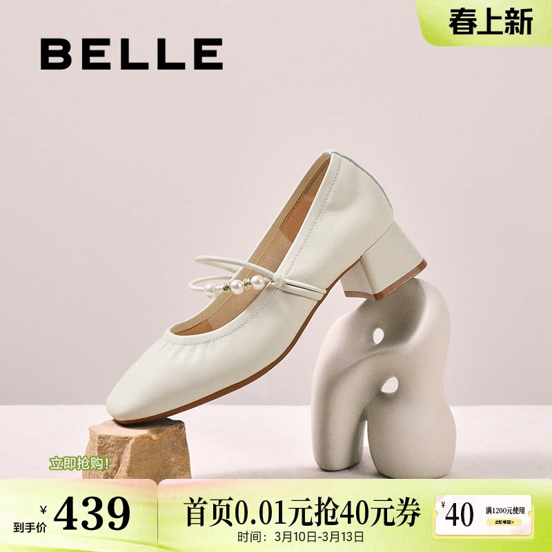 百丽复古粗高跟玛丽珍鞋女秋季新款真皮浅口单鞋子E1T1DCQ5预