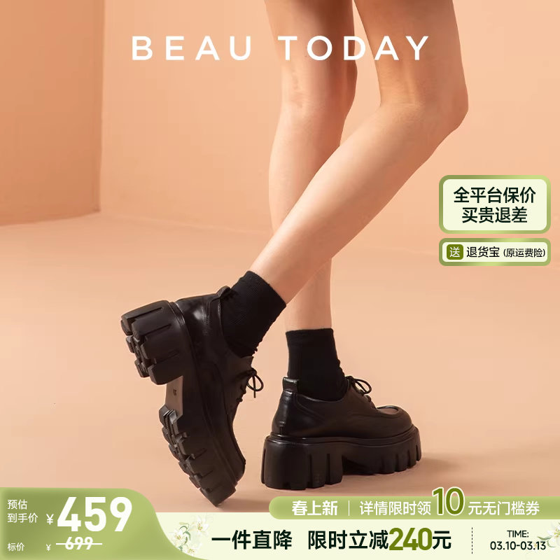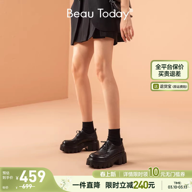 BeauToday厚底小皮鞋女英伦风乐福鞋春季真皮黑色单鞋增高鞋女
