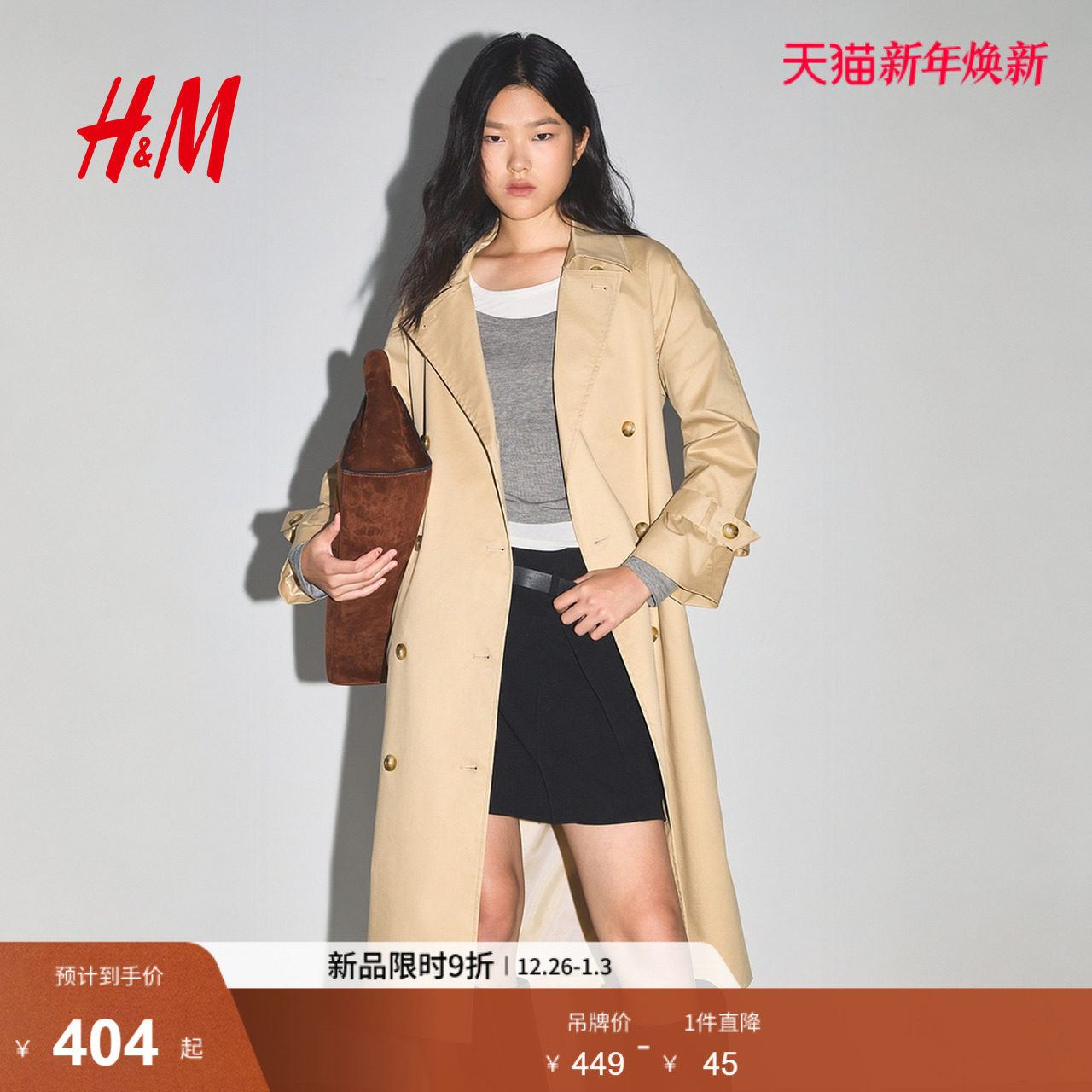 HM女装风衣冬季斜纹布收腰双排扣翻领中长款老钱风大衣1247470