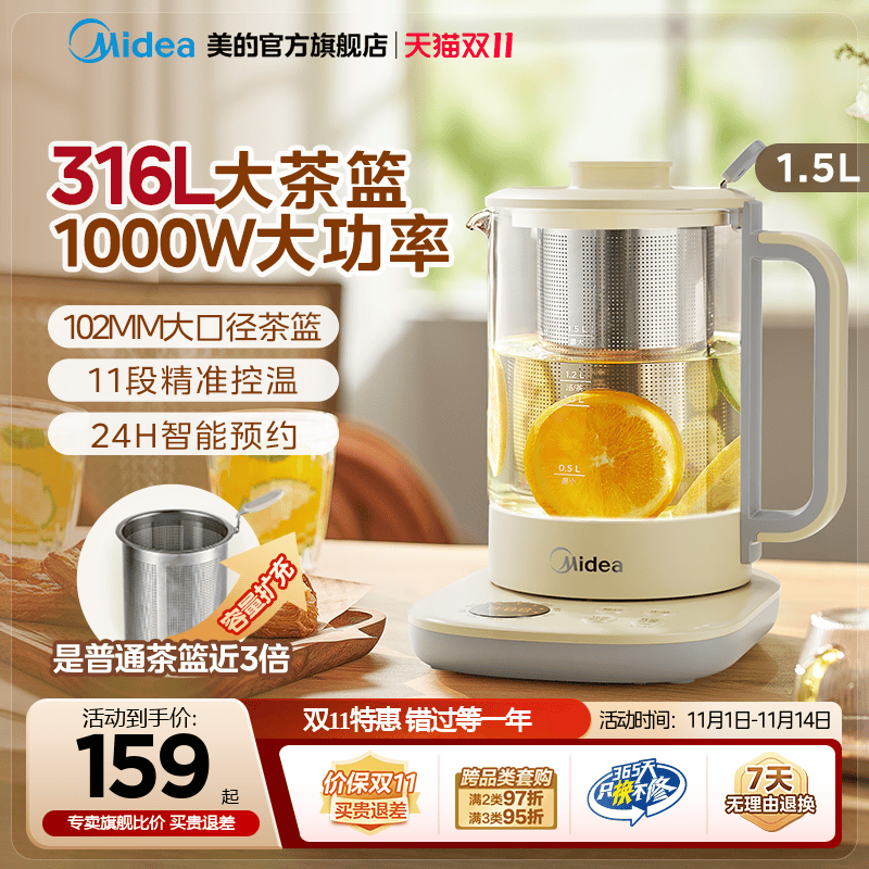美的养生壶1.5L大容量烧水壶智能预约办公室电水壶煮茶器花茶壶