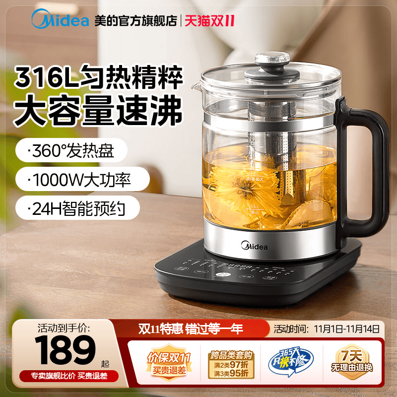 美的养生壶办公室家用多功能玻璃煮茶器全自动恒温烧水壶旗舰正品