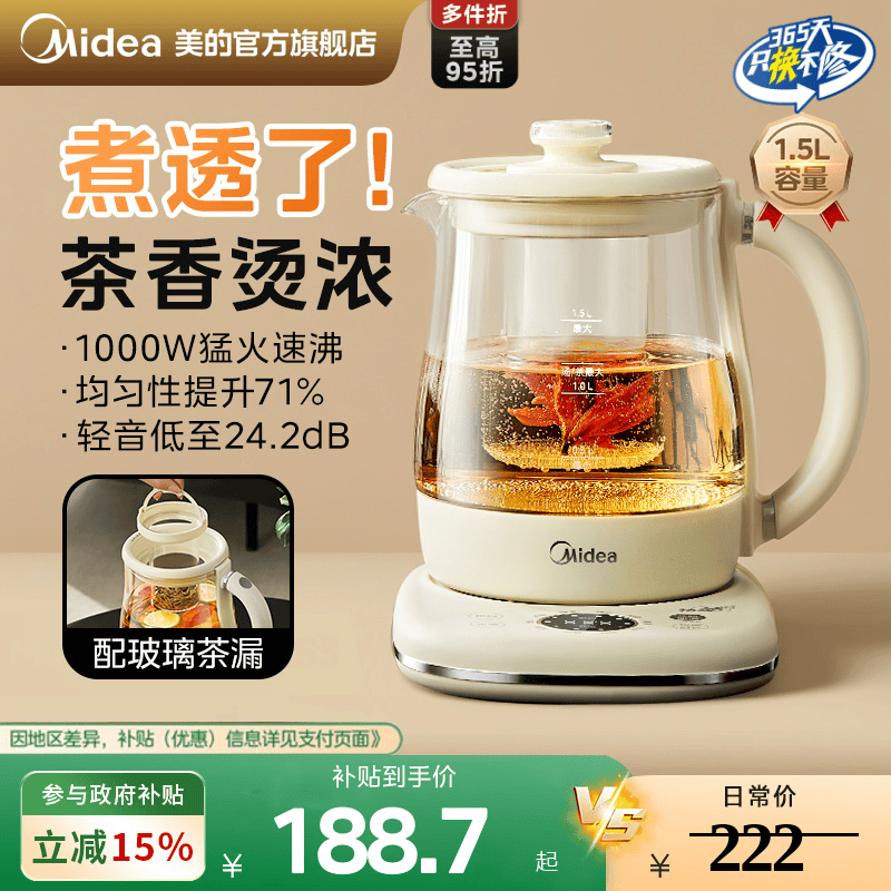 美的养生壶1.5L家用全自动玻璃恒温烧水壶办公室小型多功能花茶壶