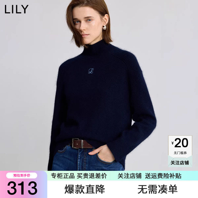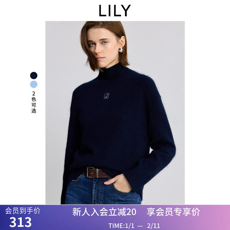 LILY2025冬新款兔绒羊毛混纺纯色半高领绣花加厚套头针织衫毛衣女