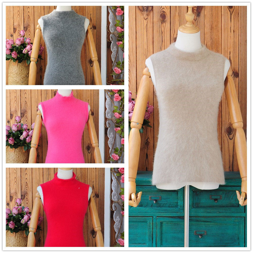 A春秋美搭甜美时尚气质修身半高领纯色无袖安哥拉长兔毛兔绒毛衣
