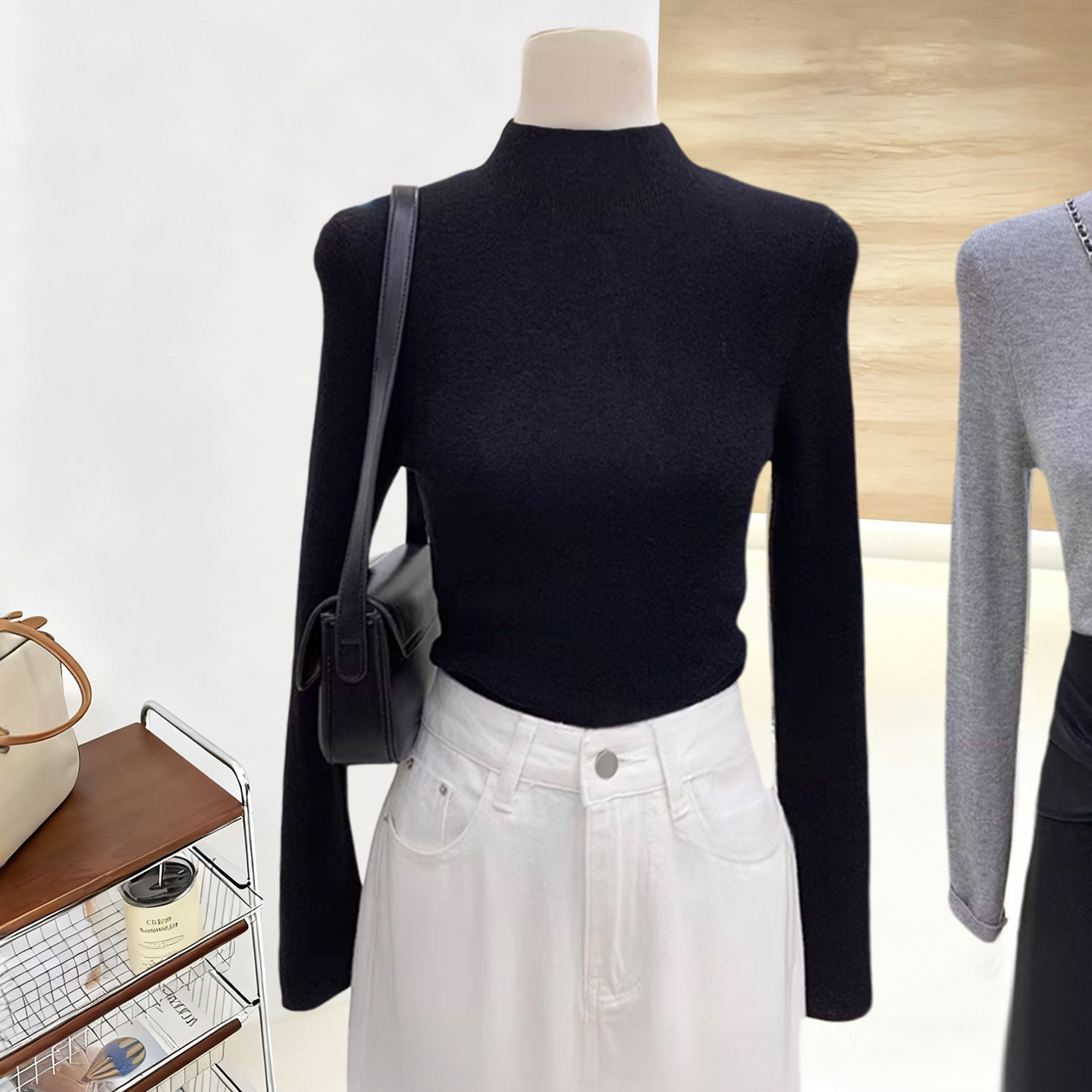 高级感黑色半高领兔绒针织打底衫女士2025年新款韩版毛衣修身上衣