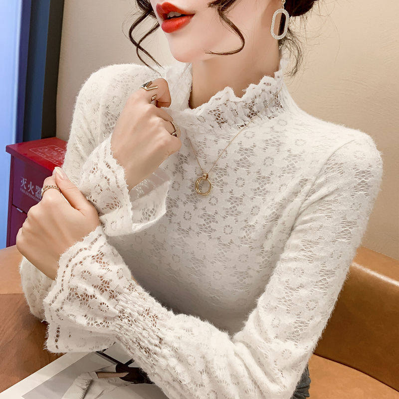 半高领兔绒蕾丝打底衫女秋冬季洋气内搭毛衣磨毛花边加绒加厚上衣