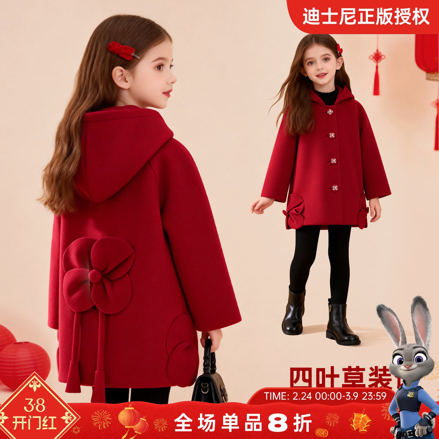 迪士尼女童红色大衣2026新款冬儿童毛呢大衣小女孩红色拜年服外套
