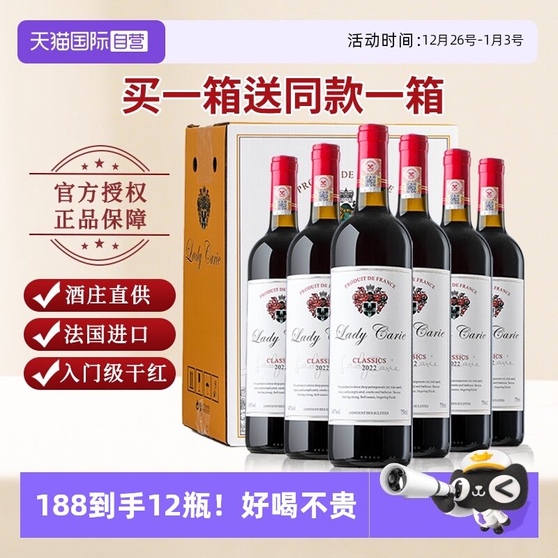 【自营】【买一箱送一箱】法国进口红酒15度干红葡萄酒整箱12支装