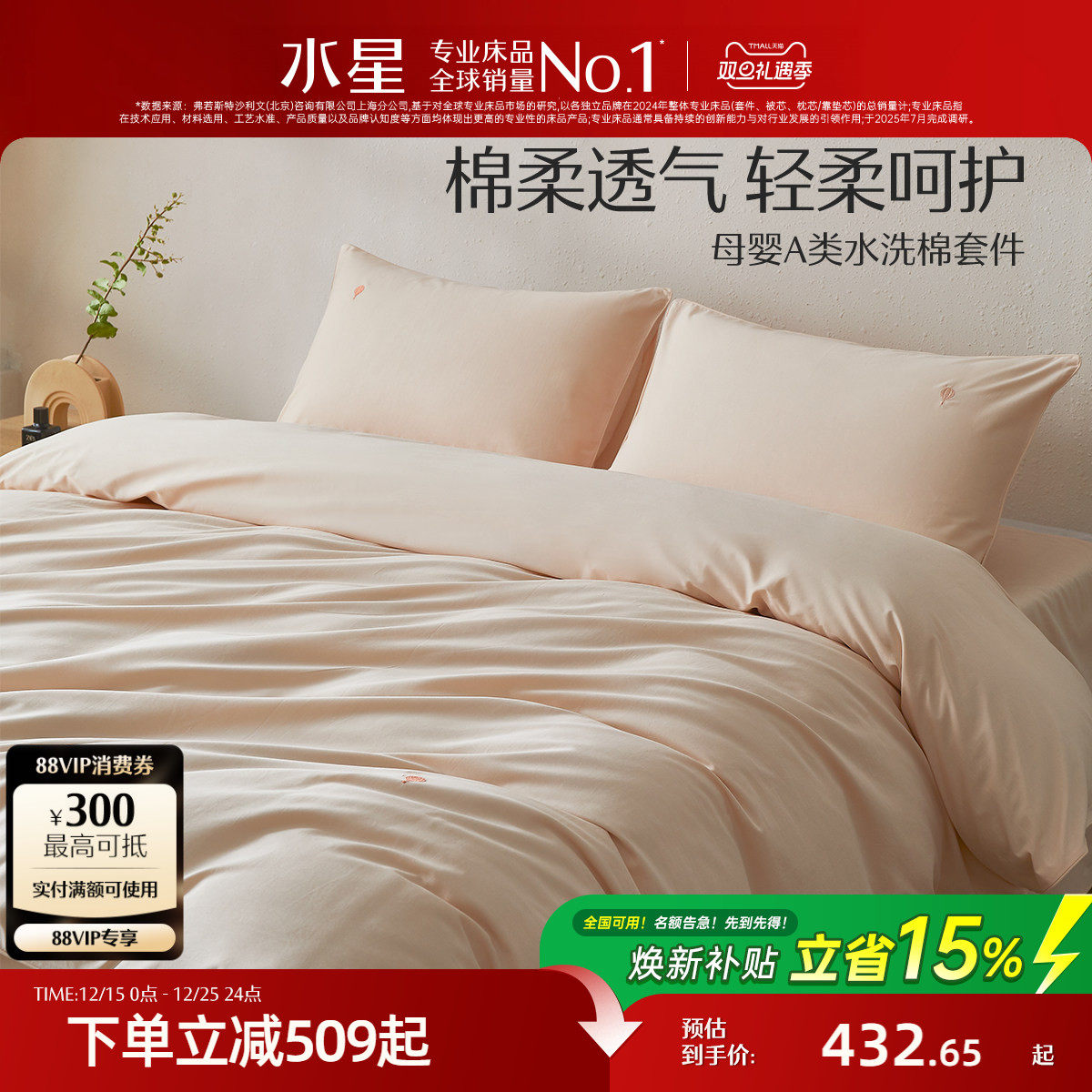 水星家纺A类全棉水洗棉四件套纯棉素色简约套件家用被套床单床品