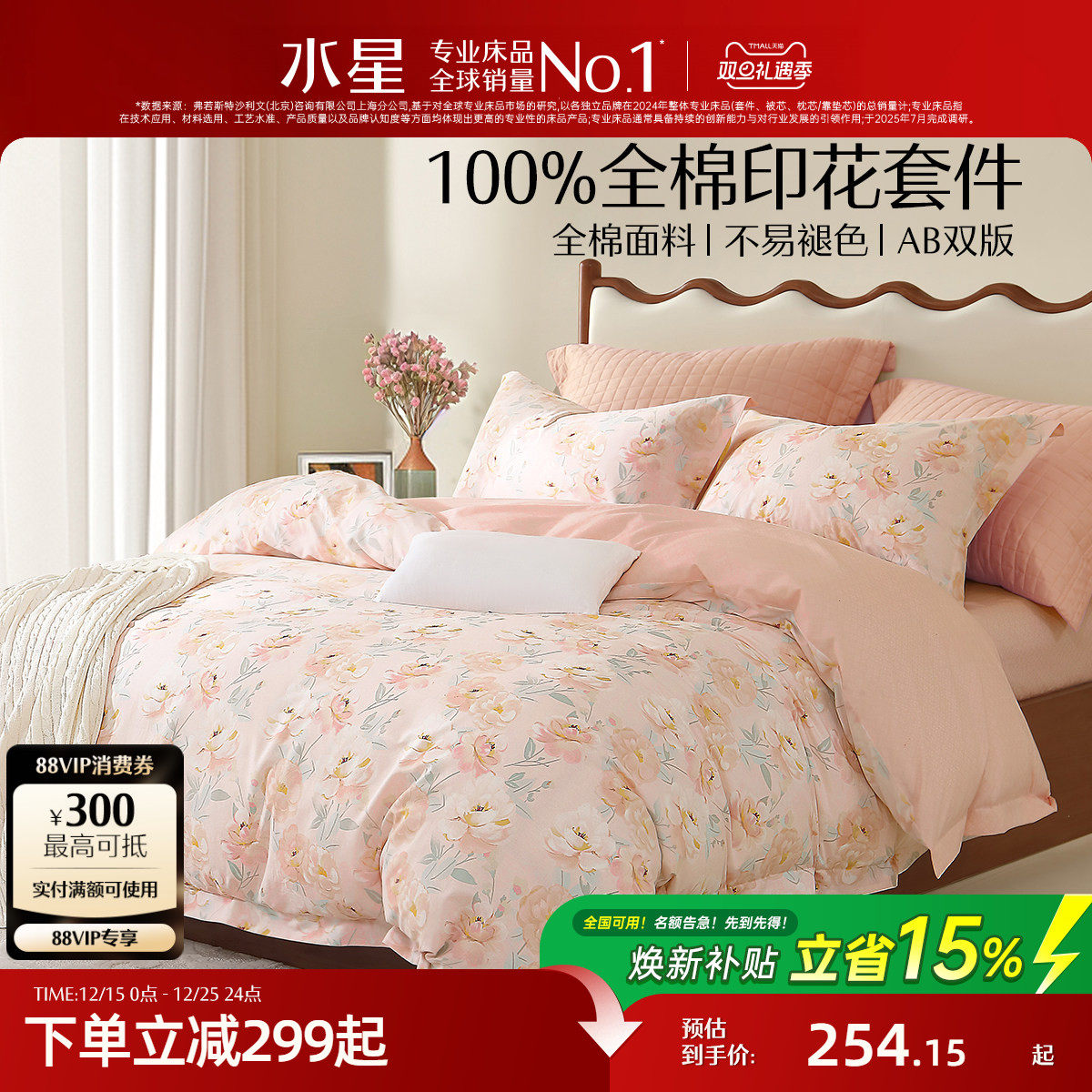 水星家纺全棉四件套纯棉印花套件小清新家用被子套床单2025年新品