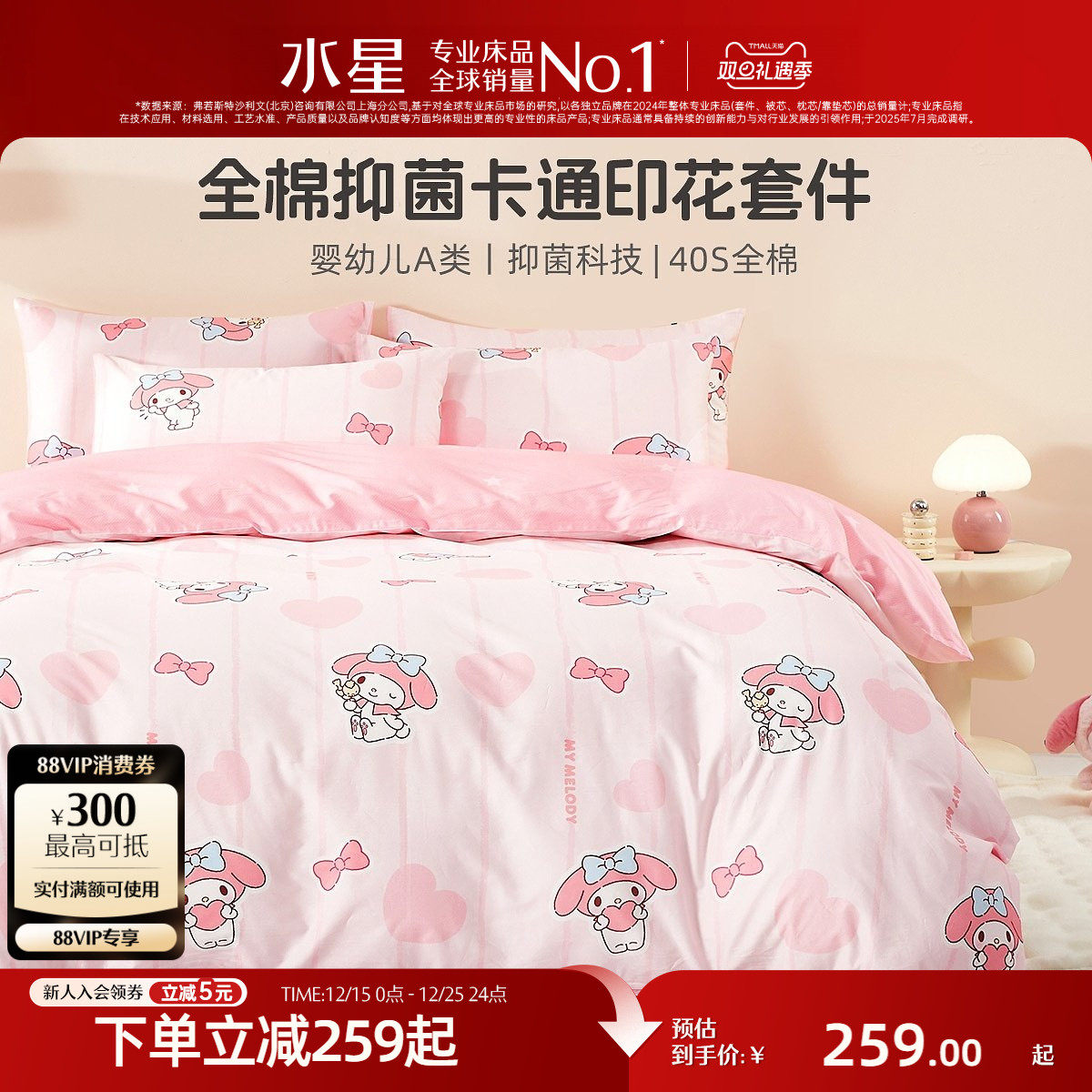 水星家纺全棉磨毛三/四件套母婴A类抑菌保暖套件被套hellokitty