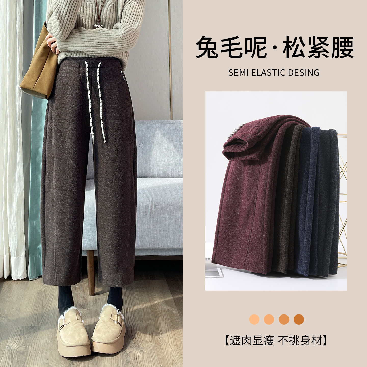 仿兔毛绒软糯松弛阔腿裤秋季宽松显瘦松紧腰毛呢运动休闲裤女垂感