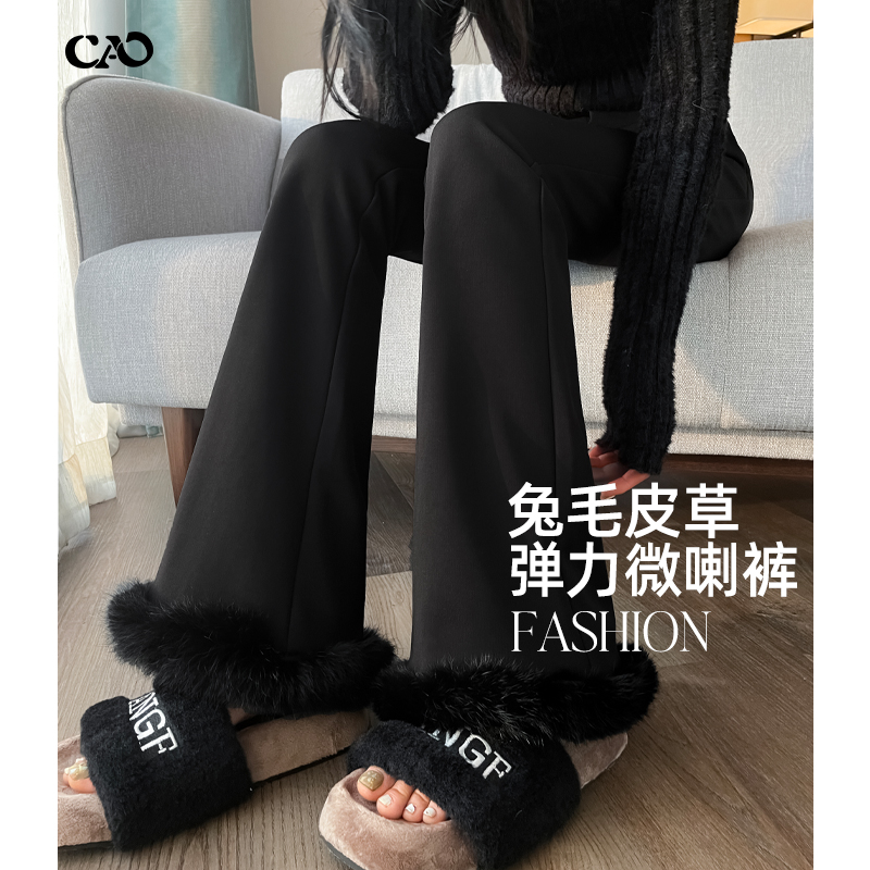 胖mm大码女装开叉微喇西装裤女秋冬黑色兔毛加绒休闲窄版喇叭裤女