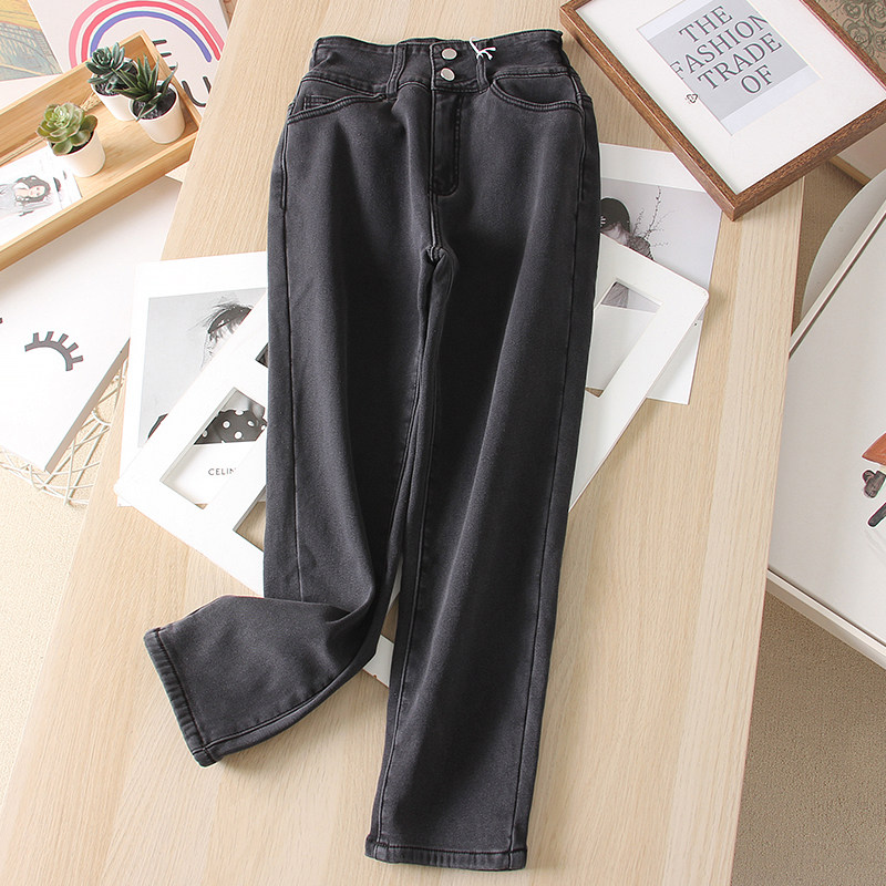 秋冬高腰加绒保暖显瘦烟灰色直筒锥形小脚口弹力牛仔长裤女大王款