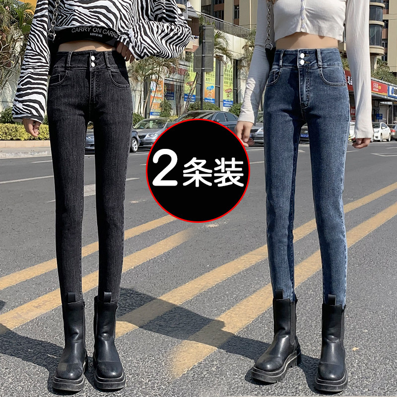 加绒牛仔裤女灰色秋冬新款紧身铅笔裤高腰显瘦百搭弹力小脚长裤子