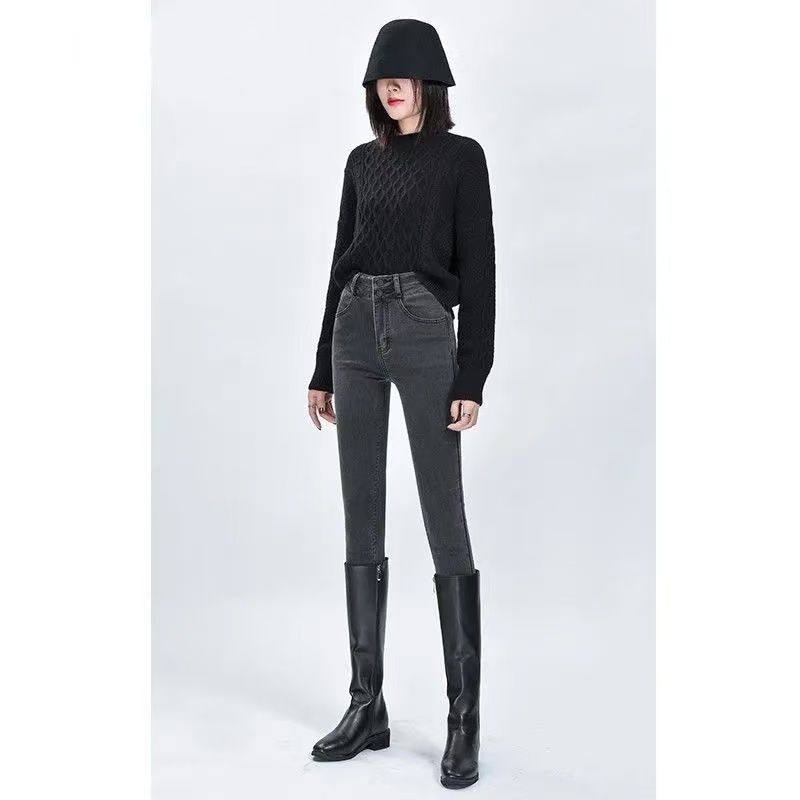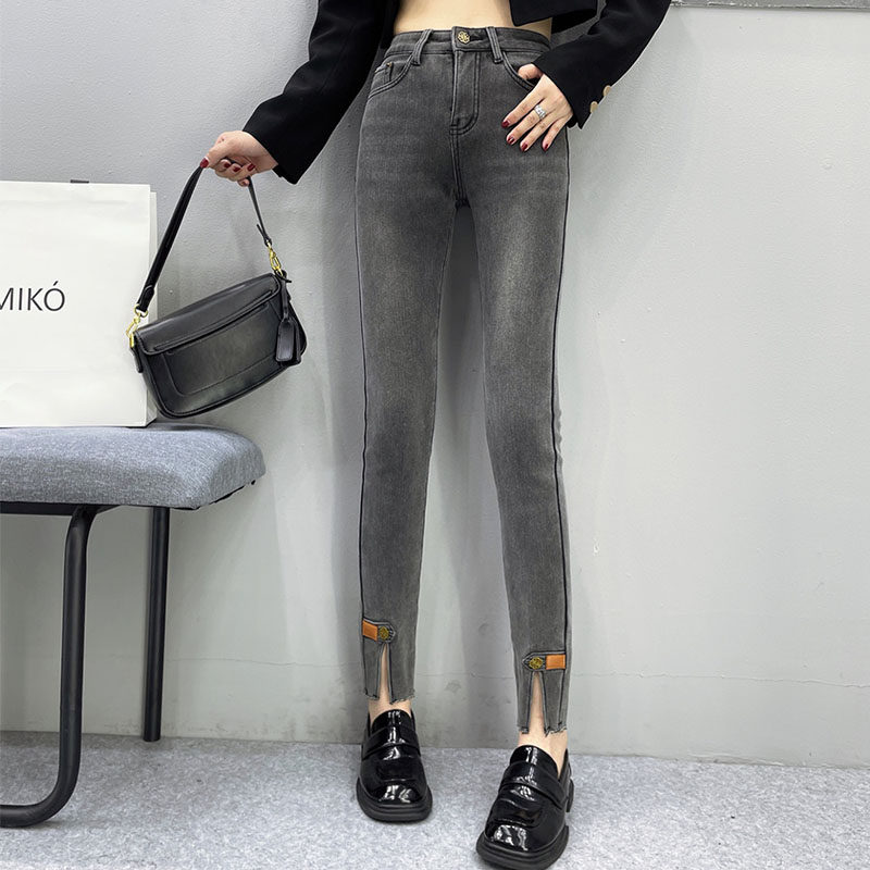 烟灰色爆款牛仔裤女2024年秋冬新款高腰加绒修身显瘦紧身小脚长裤