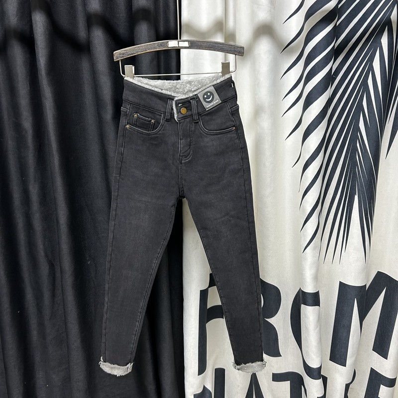 烟灰色加绒牛仔裤女秋冬新款高腰修身显瘦百搭薄绒紧身小脚长裤子