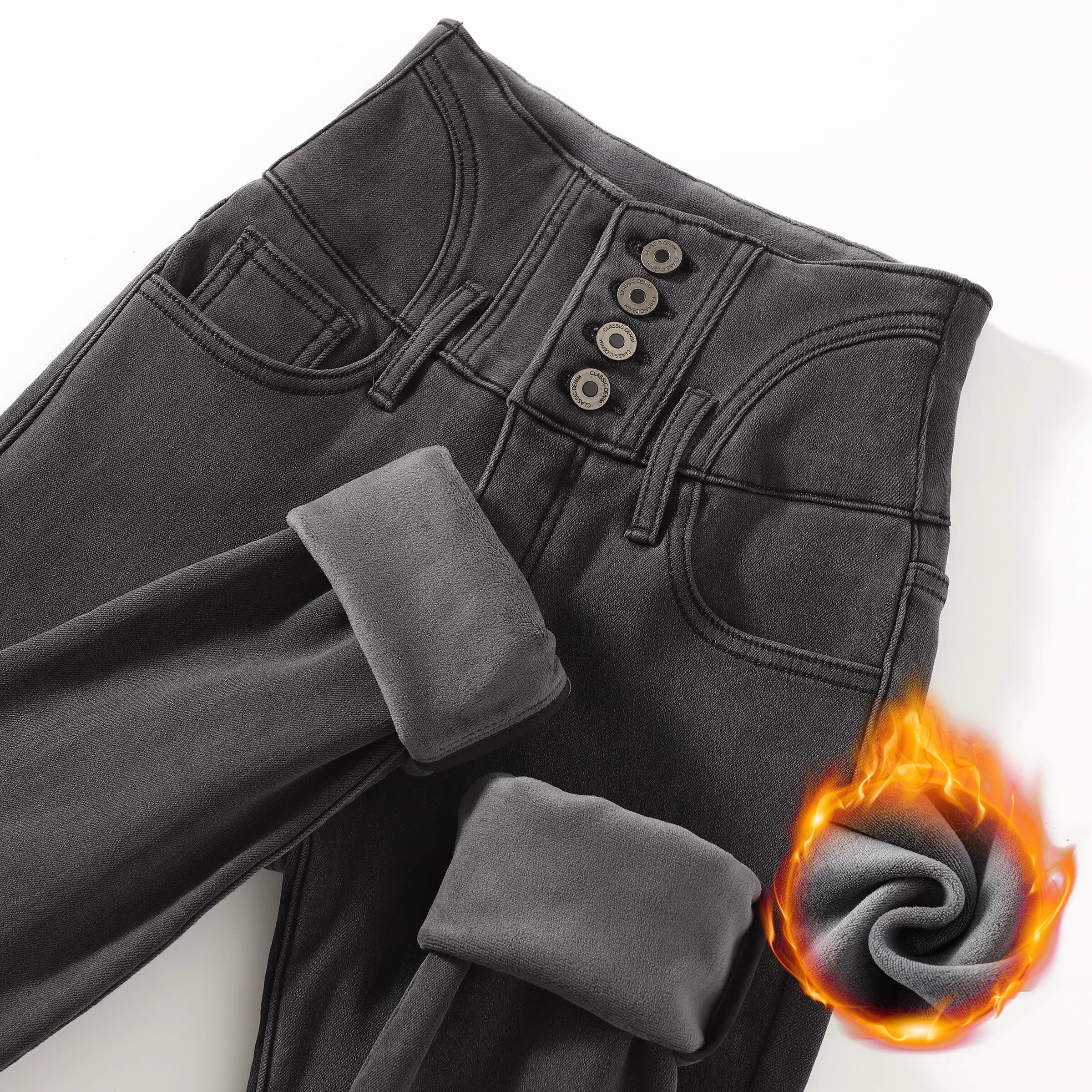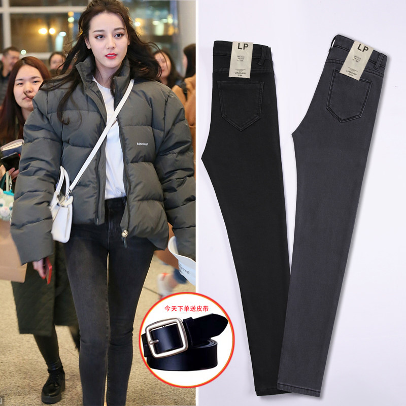 过冬必入!特显瘦洋气黑灰色高腰收腹牛仔裤女加绒修身小脚长裤冬