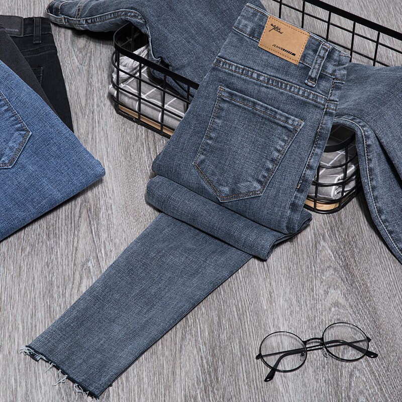 清仓捡漏烟灰色九分牛仔裤女春秋季新款高腰弹力修身显瘦小脚长裤
