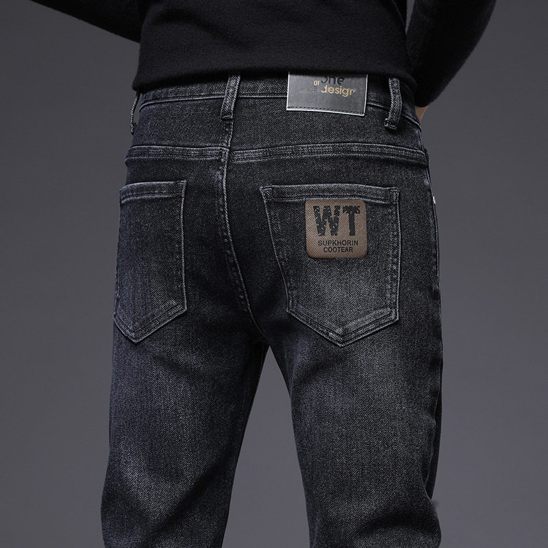 男士牛仔裤秋冬新款潮流百搭烟灰色弹力潮牌刺绣加绒加厚小脚长裤