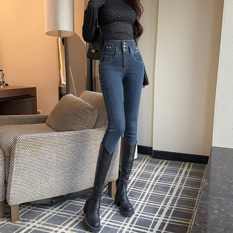 高腰显瘦牛仔裤女蓝灰色加绒长裤修身排扣铅笔小脚裤日常通勤秋冬